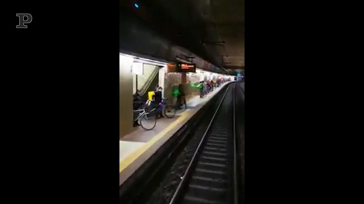 Decine e decine di rider, con zaino sulle spalle e bicicletta, di rientro dal turno di Pasqua, attende sulla banchina della stazione Garibaldi a Milano. Il video pubblicato sulla pagina Facebook di Deliverance Milano, il sindacato dei fattorini che chiede più tutele per i lavoratori.