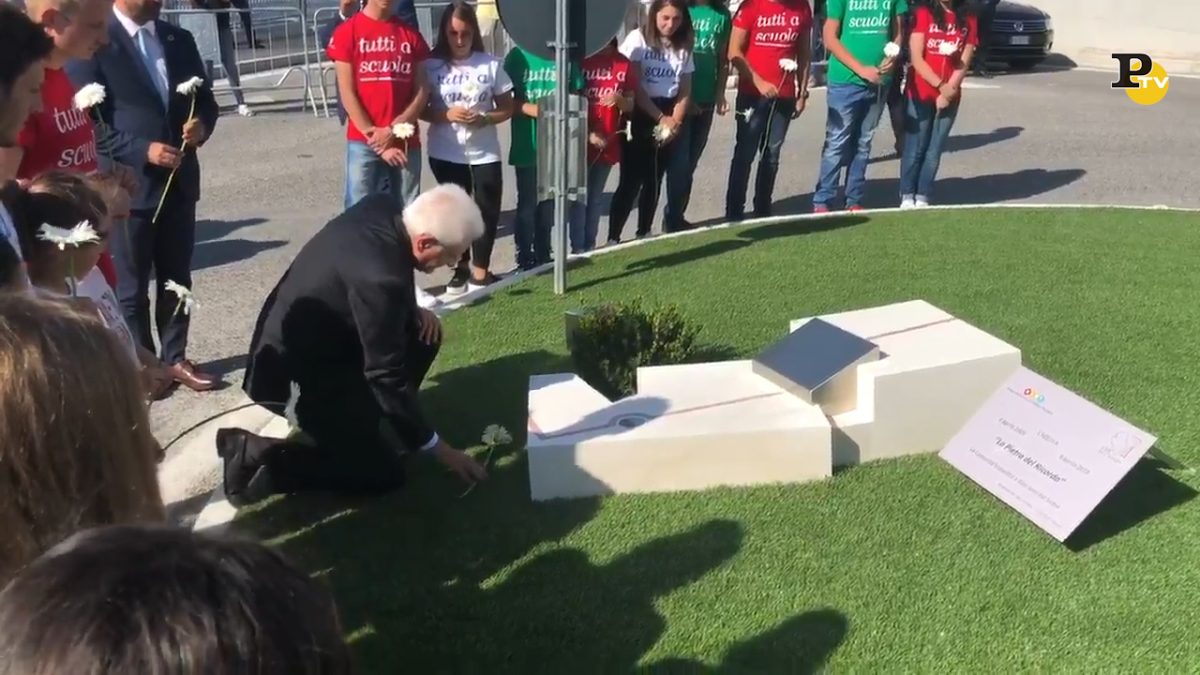 Il Presidente della Repubblica Sergio Mattarella depone un fiore presso la Pietra del Ricordo, in memoria degli studenti vittime del sisma che colpì l’Aquila nel 2009. Prima di questo gesto ha inaugurato il nuovo anno scolastico in presenza del Ministro dell’Istruzione, dell’Università e della Ricerca, Lorenzo Fioramonti.