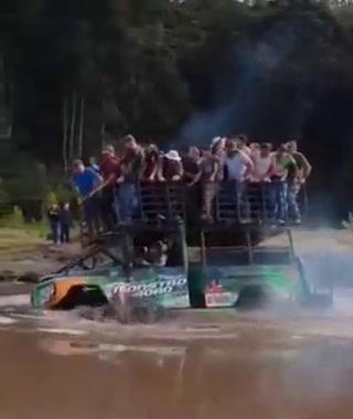 Immagini di un tentativo maldestro di un autobus di guadare un corso d’acqua. L’esperimento fallisce e tutti finiscono a mollo