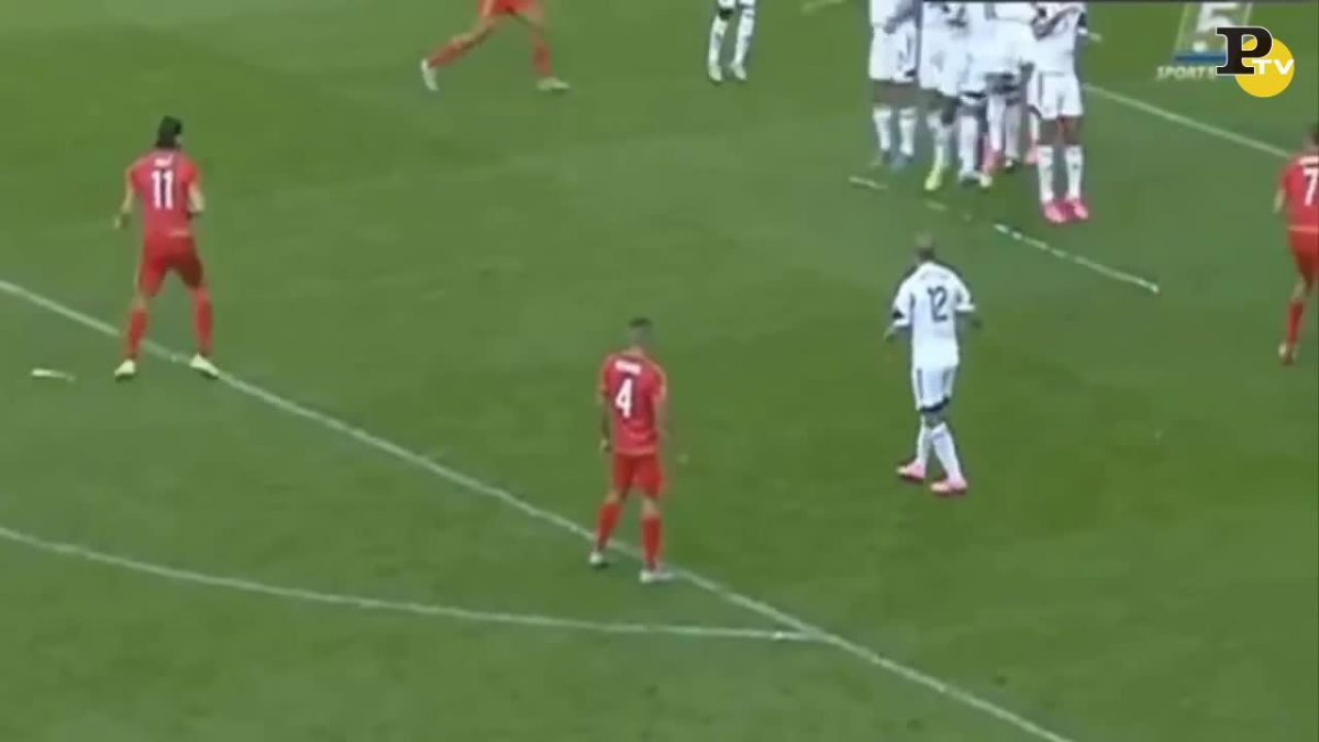Galles-Israele: Gareth Bale si prepara a battere il calcio di punizione, ma il giocatore israeliano Tal Ben Haim sembra lanciargli una maledizione con gesti di braccia e mani. Una stranezza che si conclude con un tiro fuori porta del campione del Real Madrid.