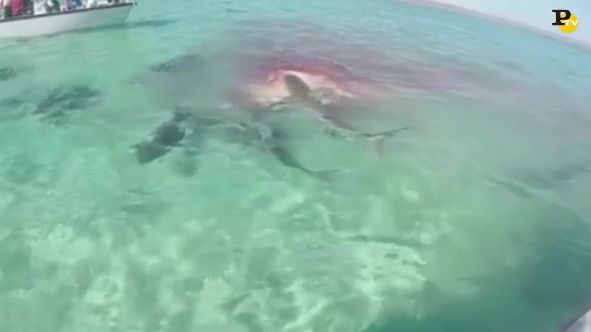 Durante una vacanza sulle coste occidentali dell’Australia dei turisti si sono trovati di fronte ad fenomeno inaspettato e spettacolare. La carcassa di una balena viene mangiata da circa 70 squali.