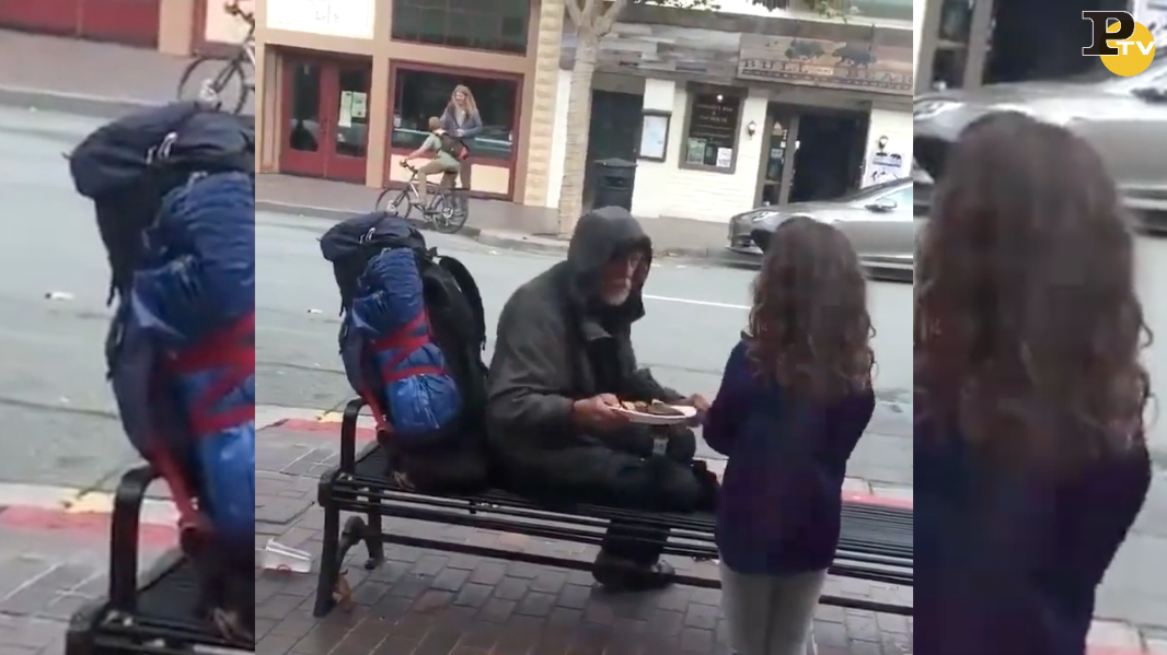 Sta facendo commuovere il web questo video che mostra una bambina negli Stati Uniti che esce dal ristorante dove sta pranzando con la famiglia e regala il suo piatto, il suo pasto, ad un clochard che riposava proprio sulla panchina che stava fuori dalla vetrina del locale.