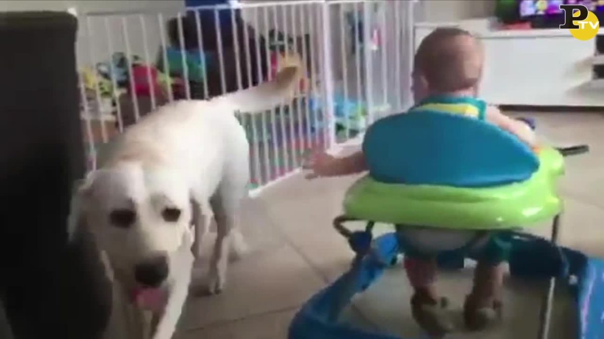 Questo tenerissimo bambino ama giocare con il suo labrador e tenta di afferrarlo per accarezzarlo.