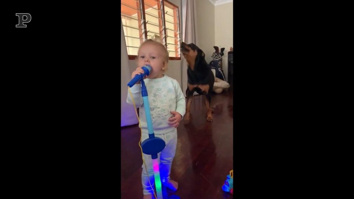 Chi dice che un cane non possa cantare? Il filmato mostra un tenero cucciolone intento a lanciarsi in una performance canora insieme al suo padroncino. Il piccolo prova il suo microfono nuovo, intonando una canzone, ed il cane lo accompagna. Un’esibizione davvero perfetta!