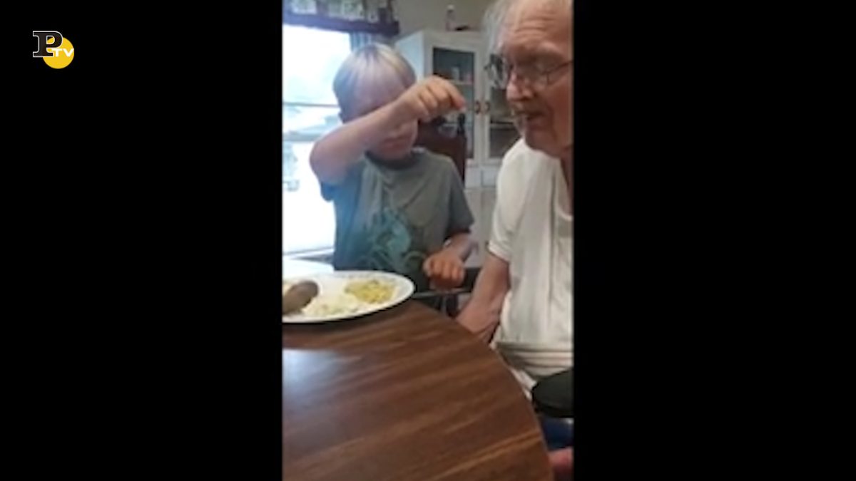 Un commovente video in cui un bambino imbocca il suo bisnonno malato, diventato virale in rete.