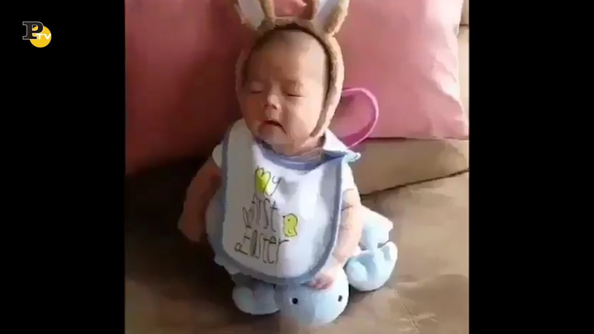 Che ridere questo simpatico bambino! Un neonato che appena fa uno starnuto cade, senza neanche accorgersi.