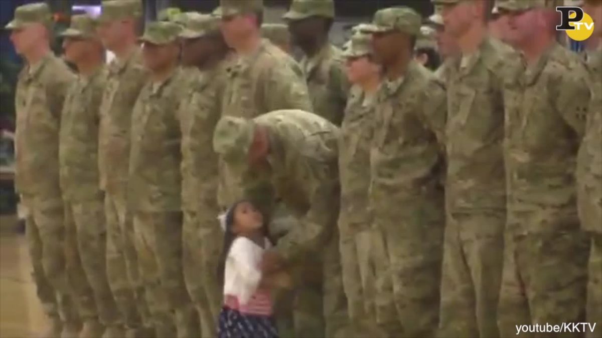 I soldati schierati, sull’attenti, il colonnello che parla, i familiari tutti in silenzio (rispettoso). L’ordine della cerimonia che festeggiava il ritorno di un plotone di Marines da mesi di stanza in Kuwait viene però interrotto dal più commovente dei fuori programma. Una bambina di 3 anni corre ed attraversa tutto e tutti per lanciarsi addosso al suo papà e lo abbraccia. Poi, una volta salutato seconda corsa per tornare dalla mamma in tribuna.