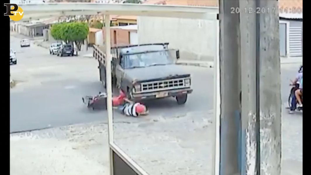 Un vero e proprio miracolo. Non si può spiegare altrimenti come questo motociclista sia sopravvissuto a questo incidente stradale avvenuto in Brasile. L’uomo, infatti, a bordo del suo ciclomotore viene investito da un furgone che gli ha tagliato la strada ad un incrocio. L’uomo cade dalla moto che scivola e viene schiacciato da una delle ruote anteriori poi rimane incastrato sotto il mezzo prima di uscirne in piedi con le proprie gambe come nulla fosse
