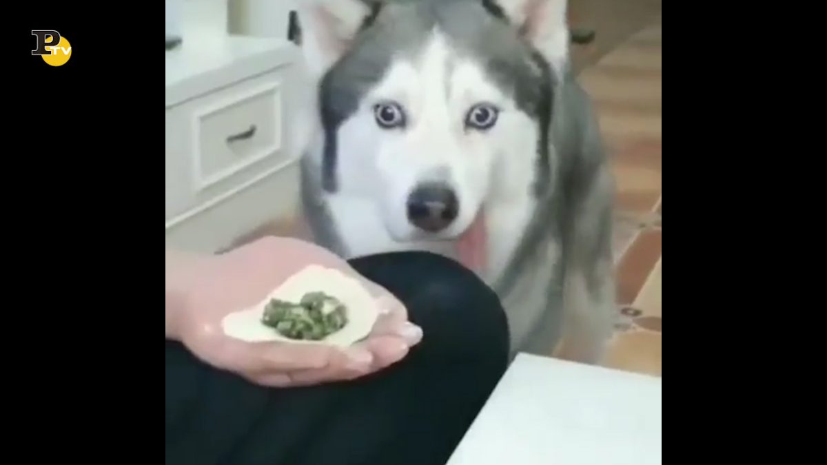 Un simpatico video che mostra un cagnolino affamato che sta aspettando che il padrone gli dia da mangiare qualcosa di appetitoso per il pranzo.