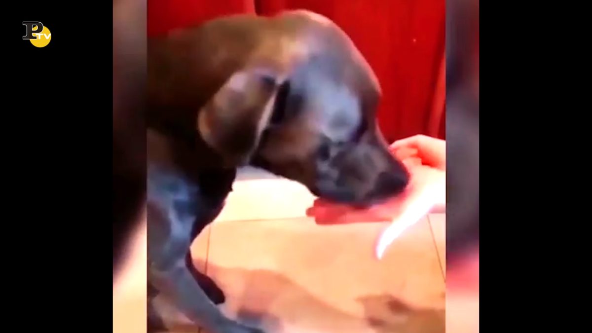 Prova con una mano e invece scopre di non aver indovinato. Rimane senza croccantini questo cagnolino affamato e sconsolato!