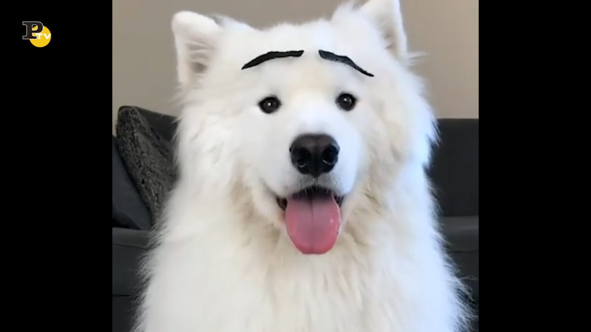 Questo cagnolino bianco molto tenero fa diverse espressioni facciali a seconda degli sopracciglie finte messe dalla sua padrona. Che divertente!