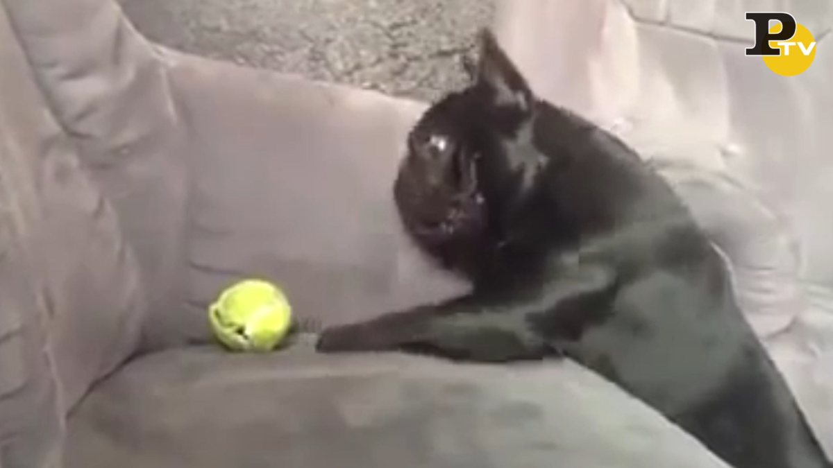 Questo piccolo cucciolo di cane lotta col divano per riuscire a prendere la pallina tanto ambita. Ma alla fine il carlino si arrende al sofà che è veramente troppo alto per riuscire ad allungarsi e raggiungere la tanto desiderata palla (Fonte: Youtube)