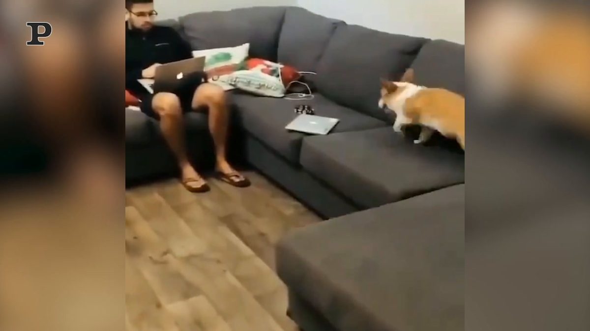 Un cane davvero scatenato è il protagonista di questo video. Non si ferma mai, e per diversi secondi continua a correre sul divano, scende e risale con balzi scattanti, gira intorno al padrone che è seduto e lavora al computer. Sperando che non fosse in un importante meeting!