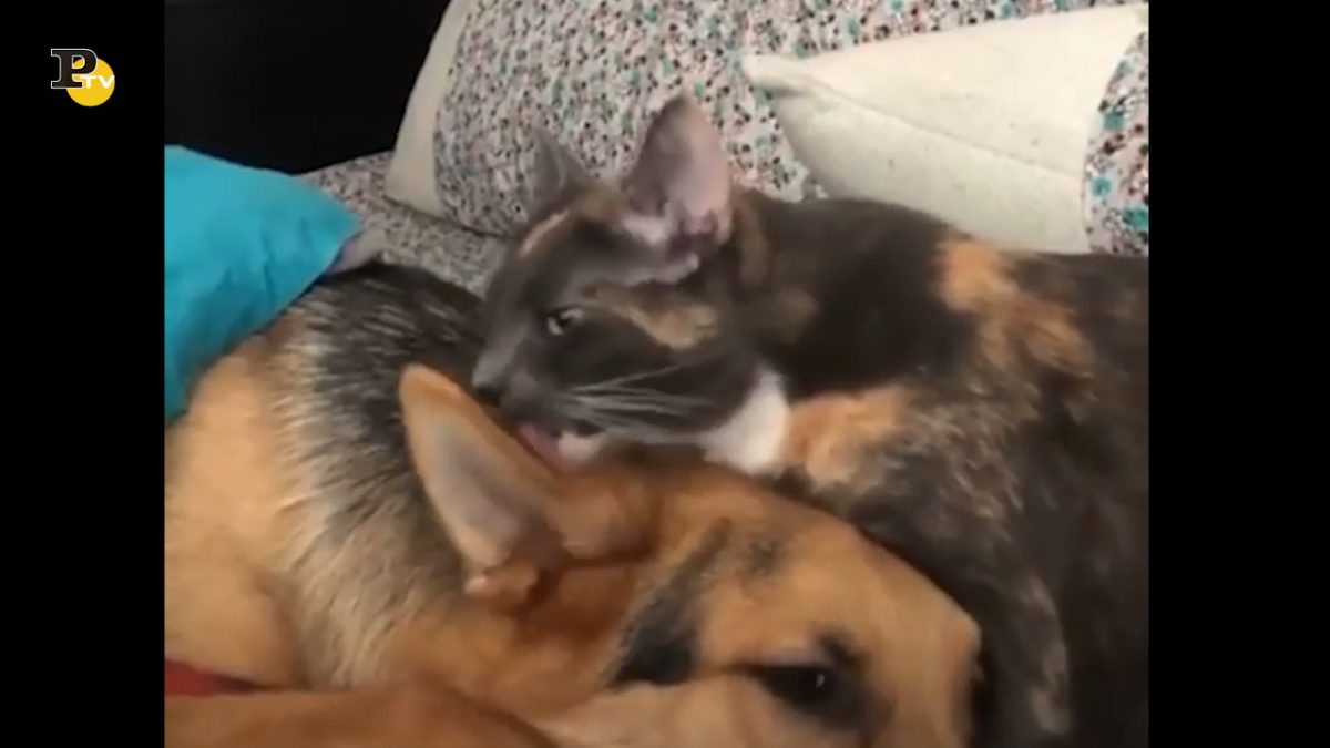 Guardate questo cane e questo gatto! Sono molto teneri, si fanno le coccole. Segno di un’amicizia senza fine.