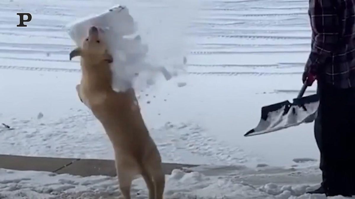 Questo cane vede il padrone spalare la neve e, anziché seguirlo, rimane davanti alla pala e indietreggia. Continua a camminare all’indietro e segue attentamente ogni movimento del padrone: non vede l’ora di giocare con la neve. Ad un certo punto l’uomo lancia la neve in aria, e il cane salta e si butta subito per prenderla. Il risultato? Tutta la neve gli è finita addosso!
