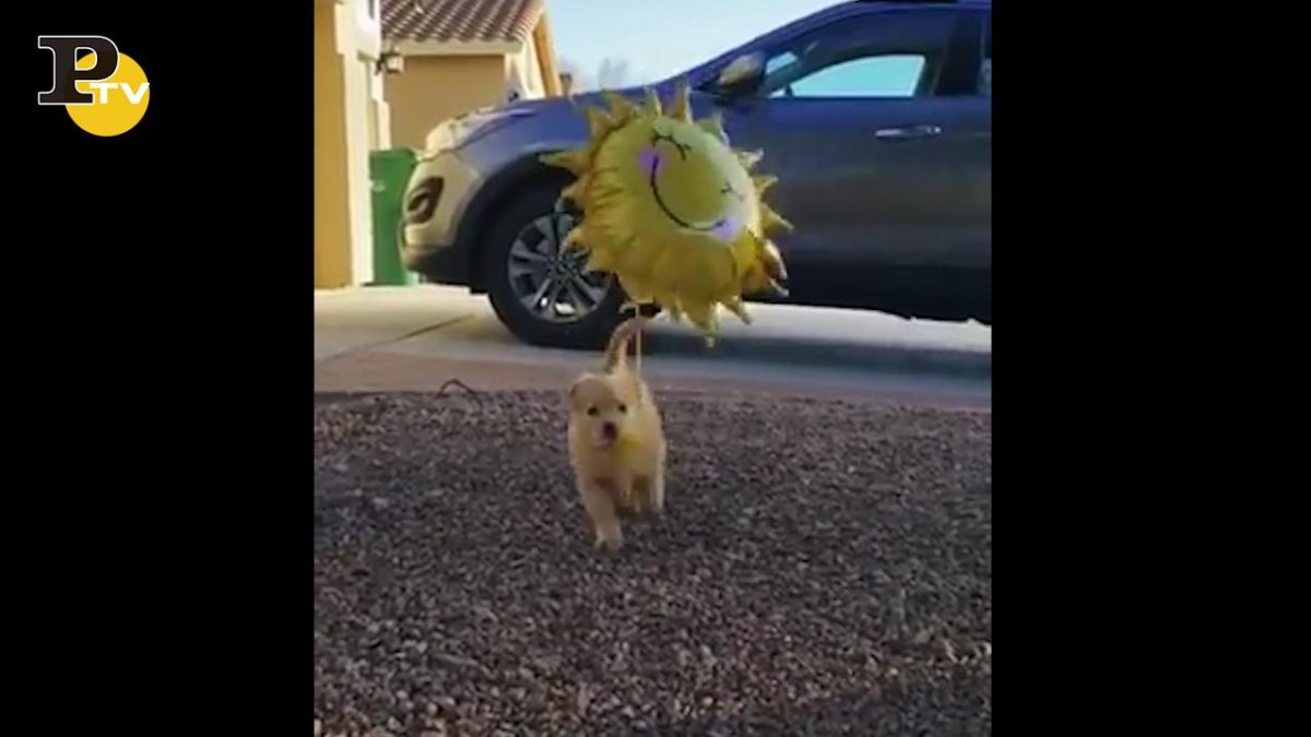 Questo cagnolino si è davvero innamorato del suo palloncino a forma di sole, e proprio come un bambino… non riesce più a staccarsene!