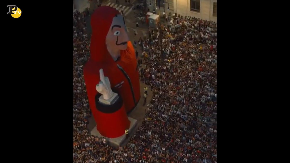 Per l’occasione Netflix ha realizzato un’installazione con una gigantesca maschera di Salvador Dalì in tuta rossa, come la divisa usata dai personaggi della serie durante la rapina alla Zecca di Madrid, accanto alla famosa scultura di Maurizio Cattelan L.O.V.E. (cioè il dito medio).
