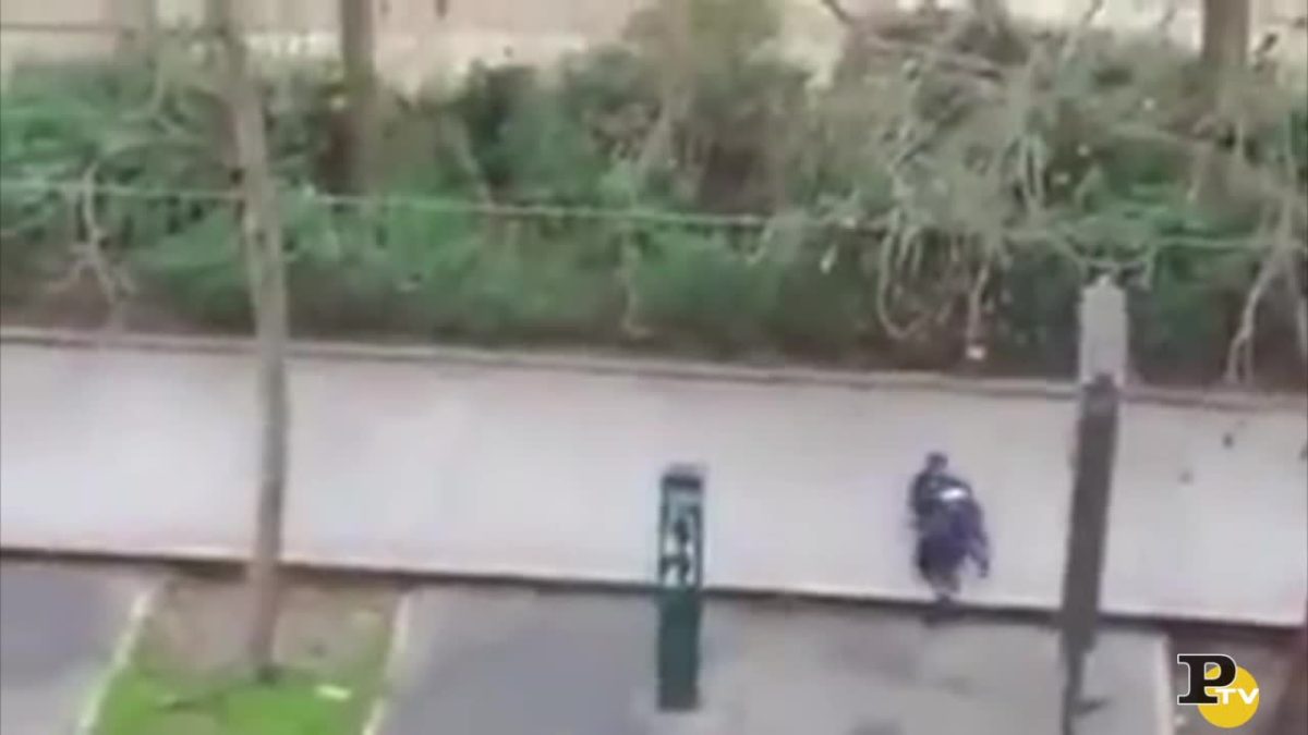 Parigi, esterno del giornale Charlie Hebdo. Un abitante della zona riprende la drammatica scena dell’uccisione di uno dei due poliziotti accorsi. Si vedono i due terroristi armati colpire uno dei due agenti che finisce a terra, poi l’esecuzione, fredda con un colpo alla testa a bruciapelo.