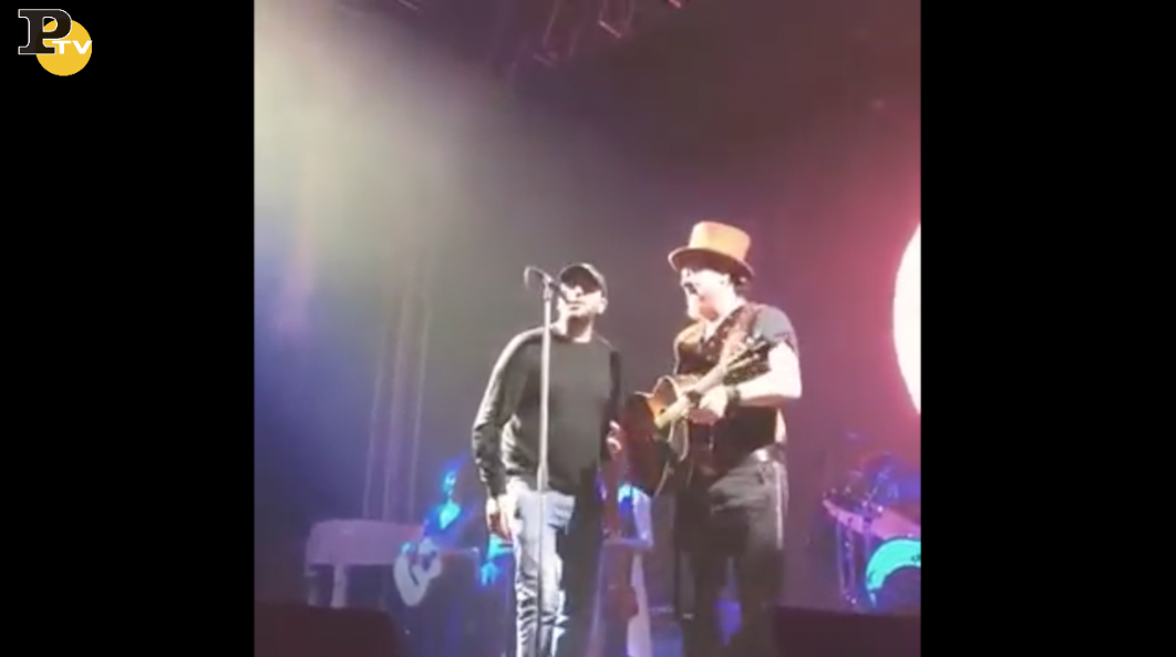 Il comico era tra gli spettatori ma non ha resistito all’idea di fare una sorpresa o forse un regalo alle migliaia di spettatori del concerto. e così eccolo salire sul palco, prendersi subito la scena e dopo alcune delle sue battute arriva la chitarra con cui ha cantato assieme al pubblico uno dei suoi successi: “Angela”