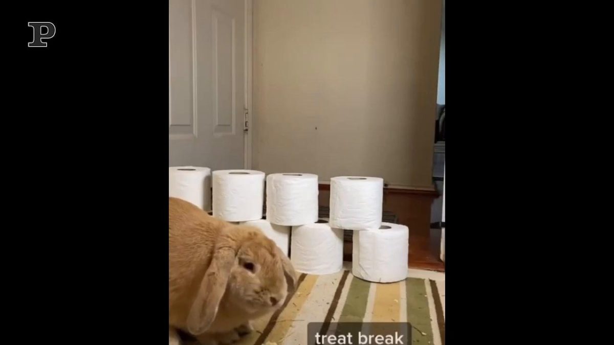 Il coniglio protagonista di questo divertentissimo video è un vero atleta. Il padrone ha preparato per lui un percorso ad ostacoli, creando delle barriere con i rotoli di carta igienica. Ed alla fine, prima con un salto e poi con un altro, il dinamico coniglietto riesce persino a superare l’altissima barriera di livello 3. Un risultato davvero strabiliante!