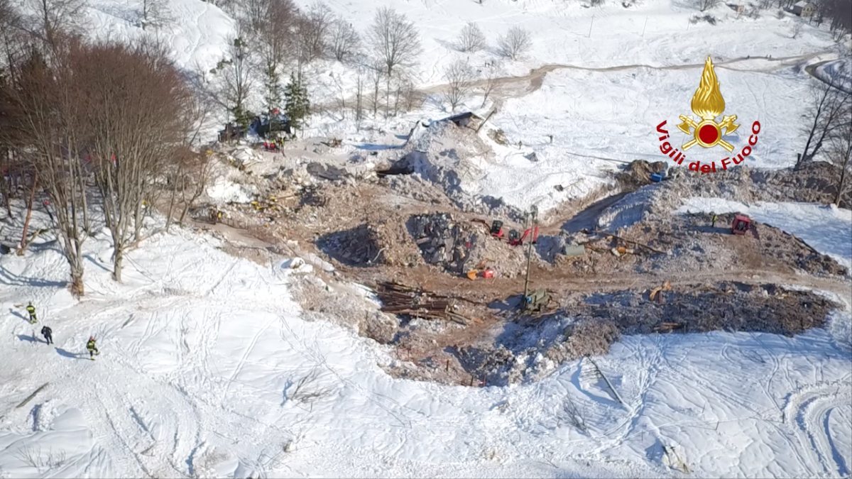 Il video è stato girato dal drone dei Vigili del Fuoco che assieme al Soccorso Alpino ed all’Esercito hanno operato per una settimana, ininterrottamente, notte e giorno, nella speranza di trovare altre persone ancora in vita sotto quella montagna di neve e macerie che ha distrutto l’albergo.