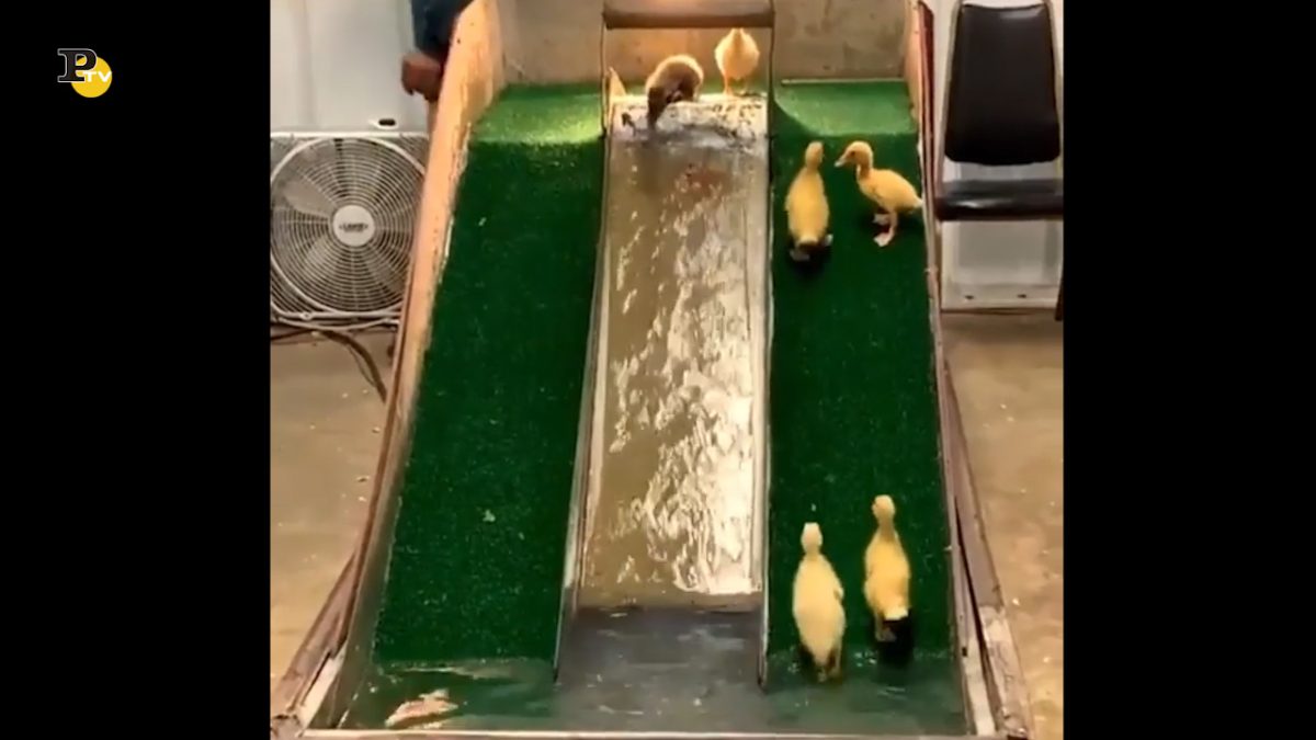 Che simpatiche queste paperelle! Giocano su uno scivolo, ciascuna aspettando il suo turno.