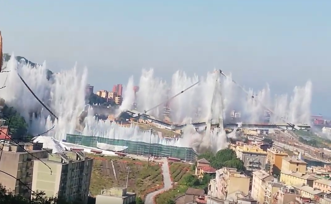 Il Ponte Morandi di Genova non c’è più. Alle 9.50 l’esplosione che lo ha demolito portando a terra piloni e centinaia e centinaia di metri di autostrada che erano ancora sospesi dopo la tragedia del 14 agosto 2018.