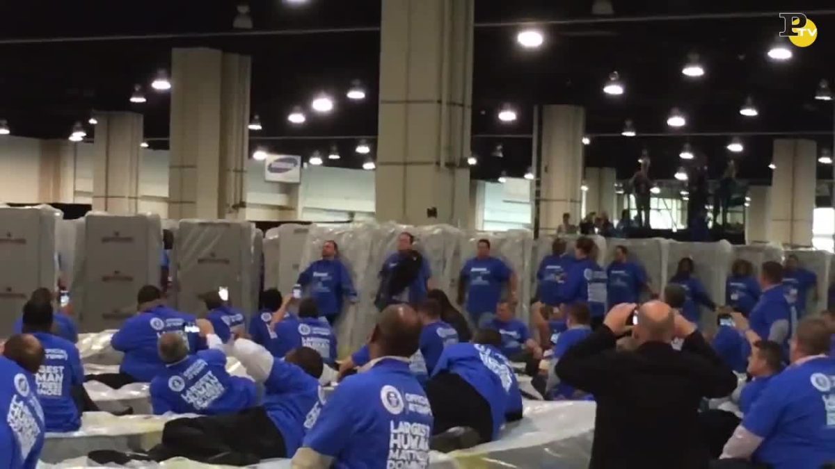 In un resort negli Stati Uniti si sono dati appuntamento 1200 persone per cercare di stabilire il record di domino umano su materasso. Un’idea nata da un’azienda Americana che ha poi donato i materassi ai senzatetto. Il tentativo, riuscito, è durato 13 minuti e 38 secondi.