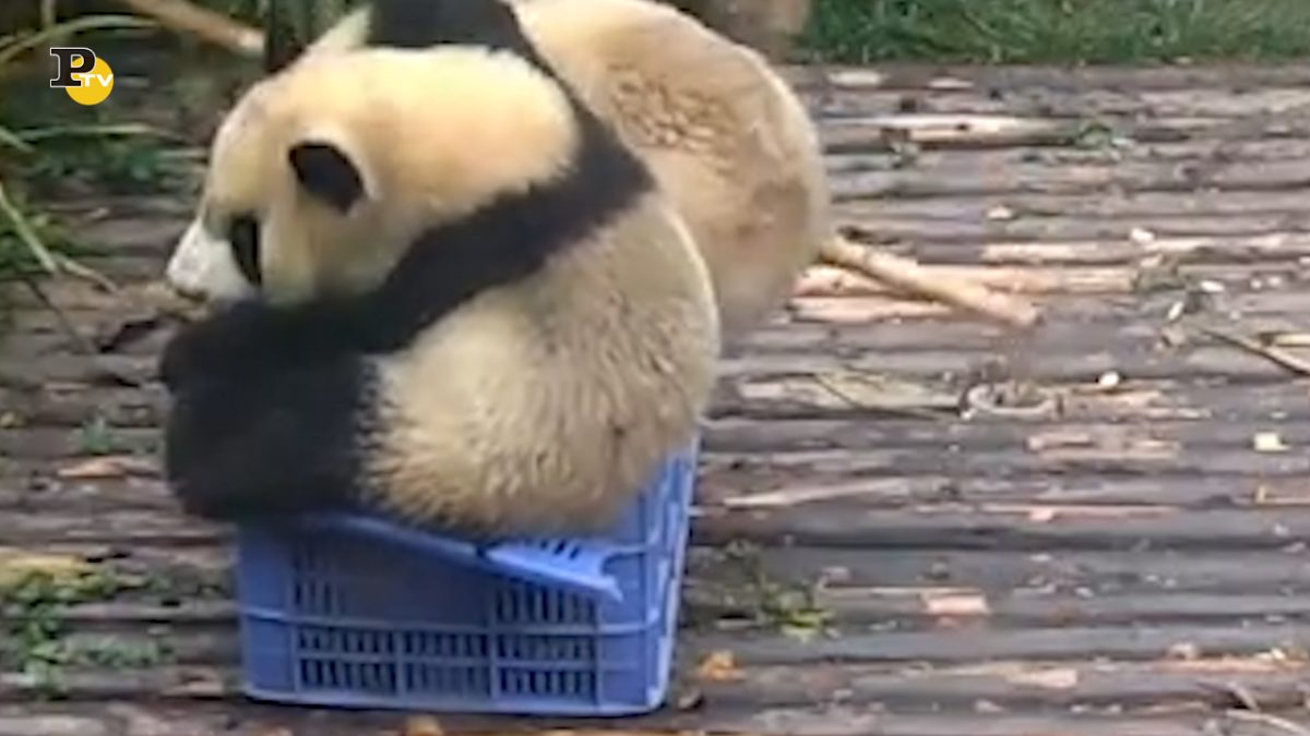 Che teneri questi panda! Cercano di entrare nella cassetta della frutta ma non sempre riescono. Complice il guardiano che vanifica questo tentativo.