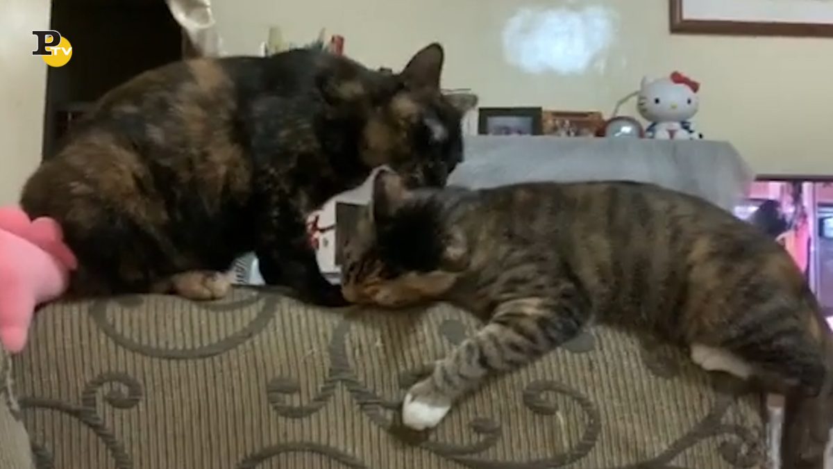 Guardate questi gatti! Sono seduti o meglio sdraiati sul divano e si fanno le coccole a vicenda. Ma poi si graffiano… Chissà se sono una coppia litigiosa.
