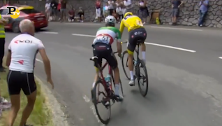 Fabio Aru, corridore sardo dell’Astana prima è coinvolto in un incidente con Chris Froome e poi gli strappa la Maglia Gialla