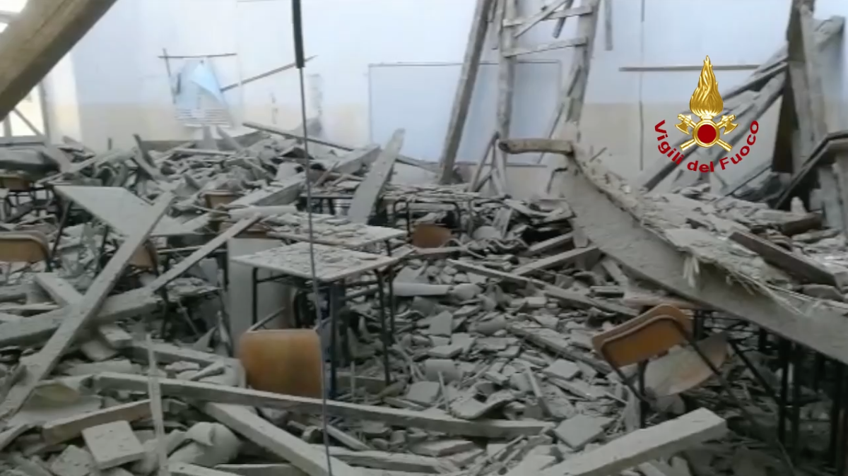 Tragedia sfiorata a Fermo, in un aula dell’Istituto Tecnico “Montani” dove è crollato il tetto di una classe. I banchi e le sedie sono stati distrutti dal pezzo di tegole, mattoni e travi che si sono riversate verso terra. Ci fossero stati gli studenti in aula in quel momento sarebbe stata di sicuro una strage. Per fortuna il crollo è avvenuto alle 7.20 del mattino quando la scuola era ancora chiusa. Insomma, una tragedia sfiorata solo per un’ora.