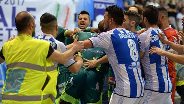 Dopo la maxi rissa con cui si è conclusa gara 1 della finale scudetto di calcio a 5 tra Pescara e Luparense arriva il comunicato del Pescara: allenamenti sospesi e quadra ritirata dalla competizione.