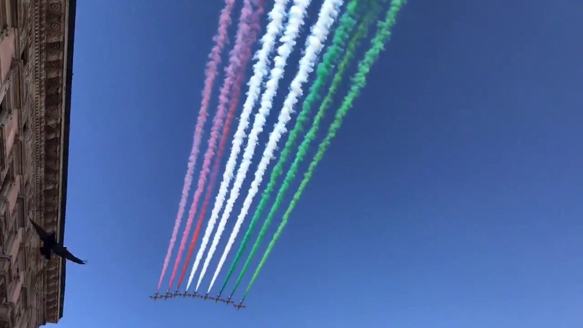 Le Frecce Tricolori hanno coperto con il verde-bianco-rosso il cielo di Milano nel primo giorno del tour d’Italia sui cieli delle città maggiormente colpite dal Covid