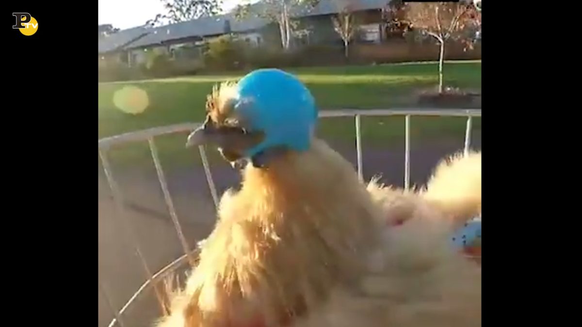 Mettere il casco è importante quando si va in bicicletta… e questa gallina lo sa molto bene!