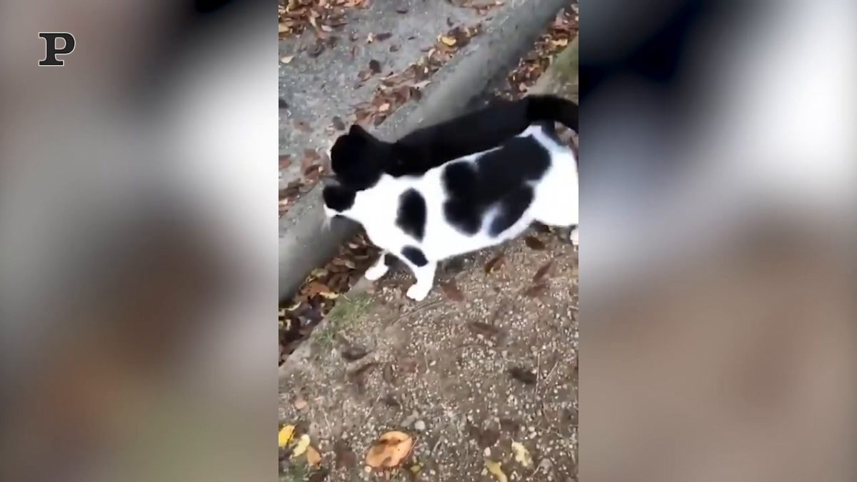 Due gatti davvero teneri: camminano uno vicino all’altro, senza mai staccarsi. Le loro code sembrano unirsi, come se si tenessero per mano. Una scena molto dolce che sta facendo sorridere centinaia di utenti. Si strusciano e si coccolano come se fossero una coppia affiatata.