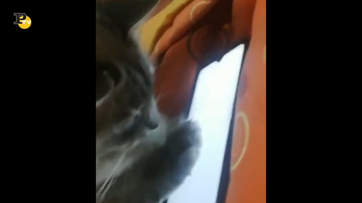 Questo tenero gattino tocca lo schermo del cellulare non appena vede qualcosa muoversi. Che simpatico!