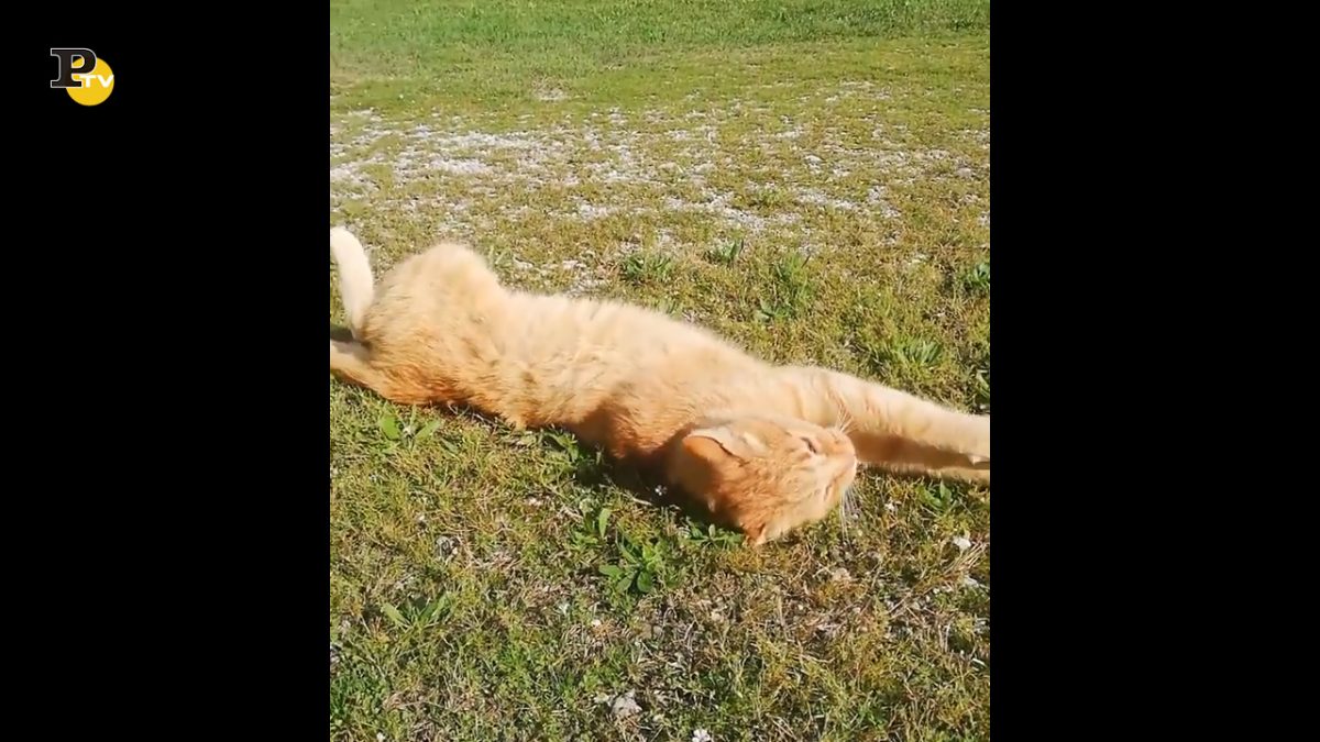Che simpatico gattino! Gira su se stesso alla ricerca della sua coda, disteso sul prato di un parco.