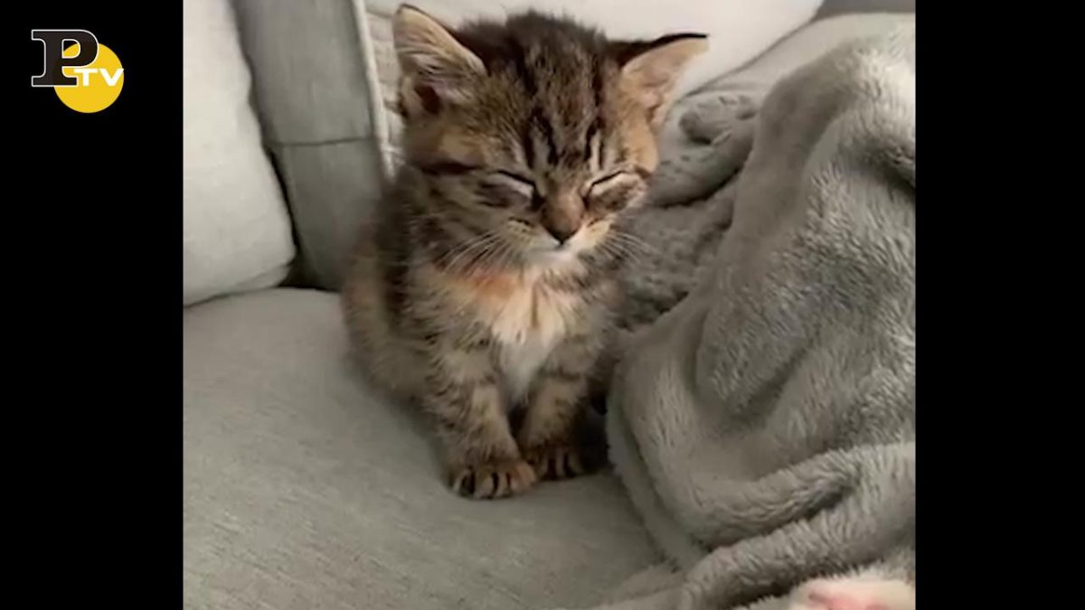 Questo tenero gattino è davvero stanco… e non riesce proprio a svegliarsi e a tenere gli occhi aperti!