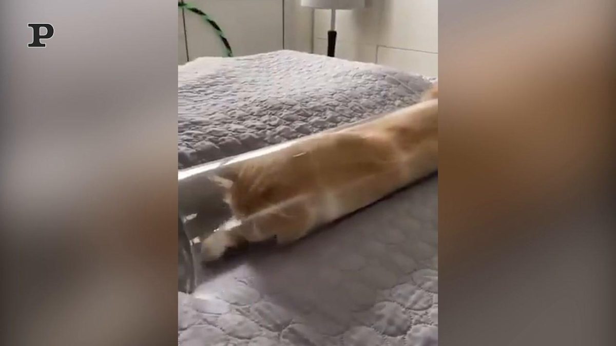 Il gatto dal potere di restringersi in base al contenitore in cui si infila: striscia dentro un vaso di vetro a forma di tubo molto stretto, fino in fondo, con il rischio di non poter più uscire. Ad un certo punto arriva fino in fondo e si ferma, forse incerto sul da farsi. Allora piano piano retrocede ed esce dal vaso, tornando alla sua forma naturale: un gatto talmente peloso da sembrare grasso!