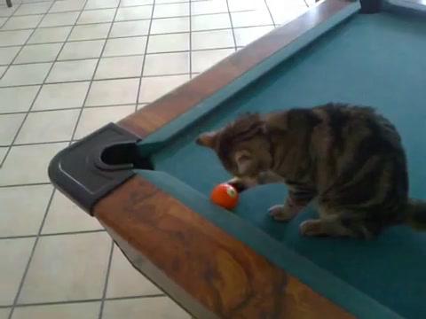 Cosa ci fa un gatto su un tavolo da biliardo? Probabilmente avrà deciso di allenarsi per riuscire finalmente a sfidare il suo padrone. Il video mostra il piccolo alle prese con la sua prima partita: prima scruta il tavolo, poi fa rotolare la palla e infine dritta in buca. Che colpo!