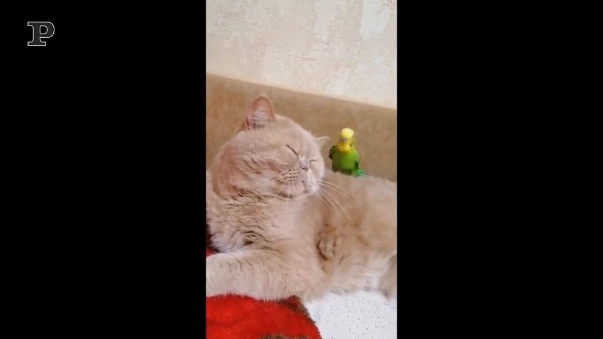 Quest’adorabile pappagallino sembra proprio non riuscire a staccarsi dal suo nuovo amico felino: gli cammina sul dorso, gli massaggia la nuca con i suoi piccoli artigli per poi accarezzargli i baffi con il becco. E dal canto suo, il gatto sembra assolutamente apprezzare. Una scena piena di tenerezze a cui è impossibile resistere!