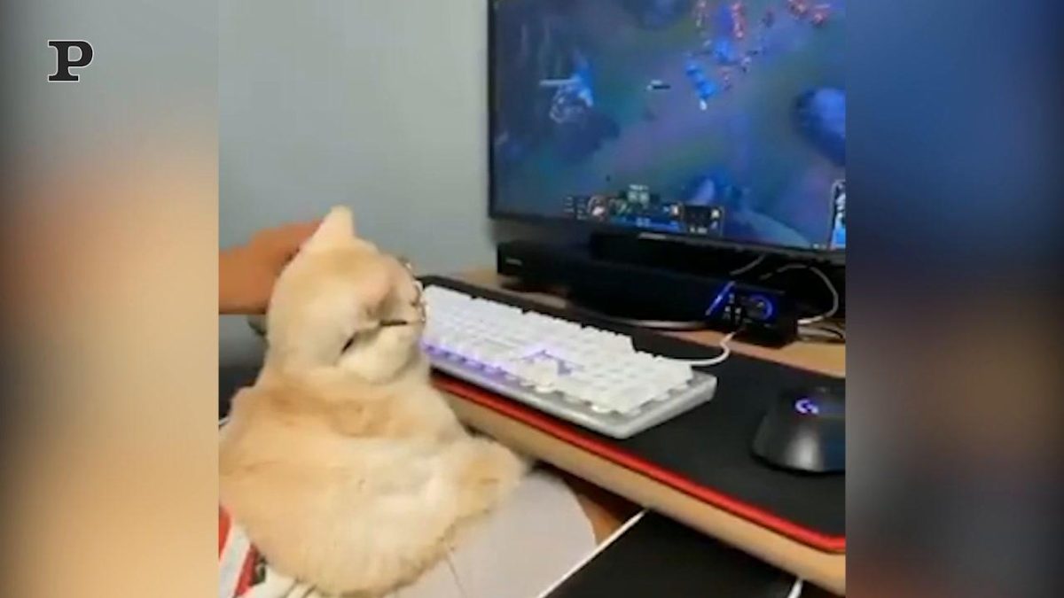 Questo simpaticissimo gattino si diverte a giocare ai videogiochi insieme alla sua padrona. Mentre lei è intenta a rilassarsi, lui seduto comodamente sulle sue ginocchia schiaccia i comandi della tastiera per condividere una partita con la sua amica umana. Che coppia!