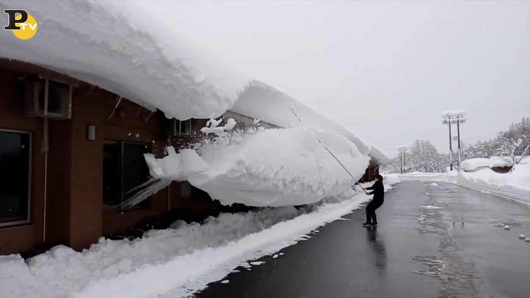 Un colpo unico, secco dato con un lungo bastone. E’ bastato questo ad un giovane ragazzo giapponese per togliere la montagna di neve che ricopriva il tetto della casa dove vive.