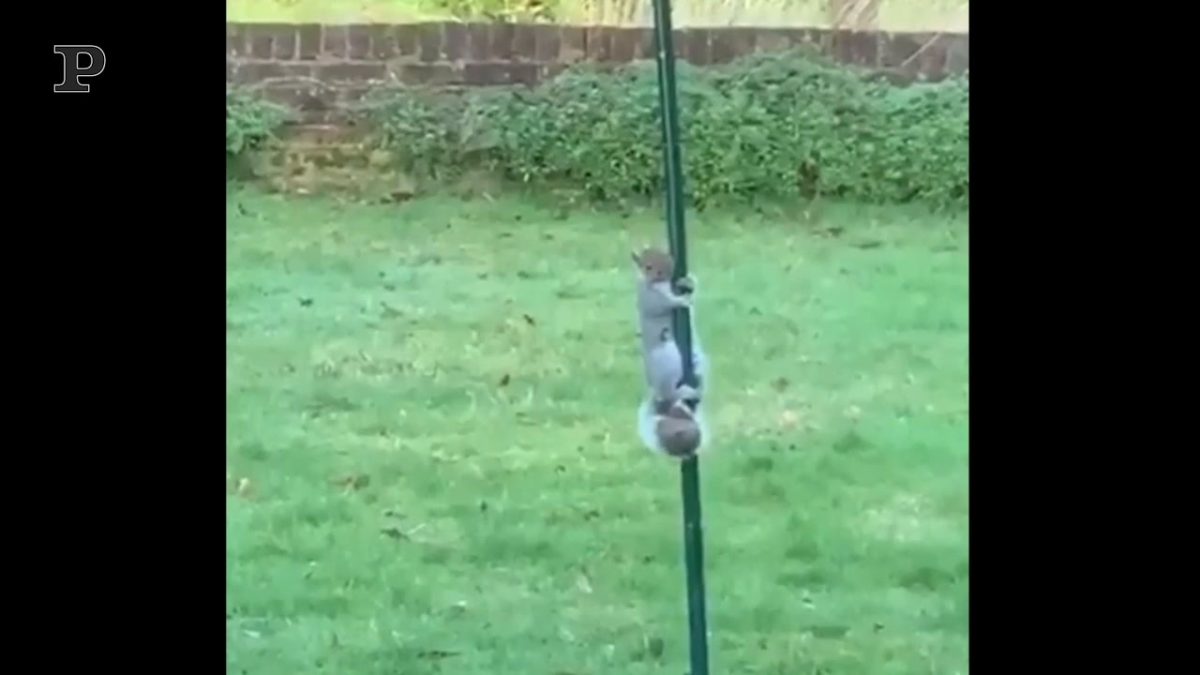 Un piccolo scoiattolo cerca di salire su un palo, ma alla fine, stanco per il troppo sforzo, rinuncia a continuare nell’impresa.