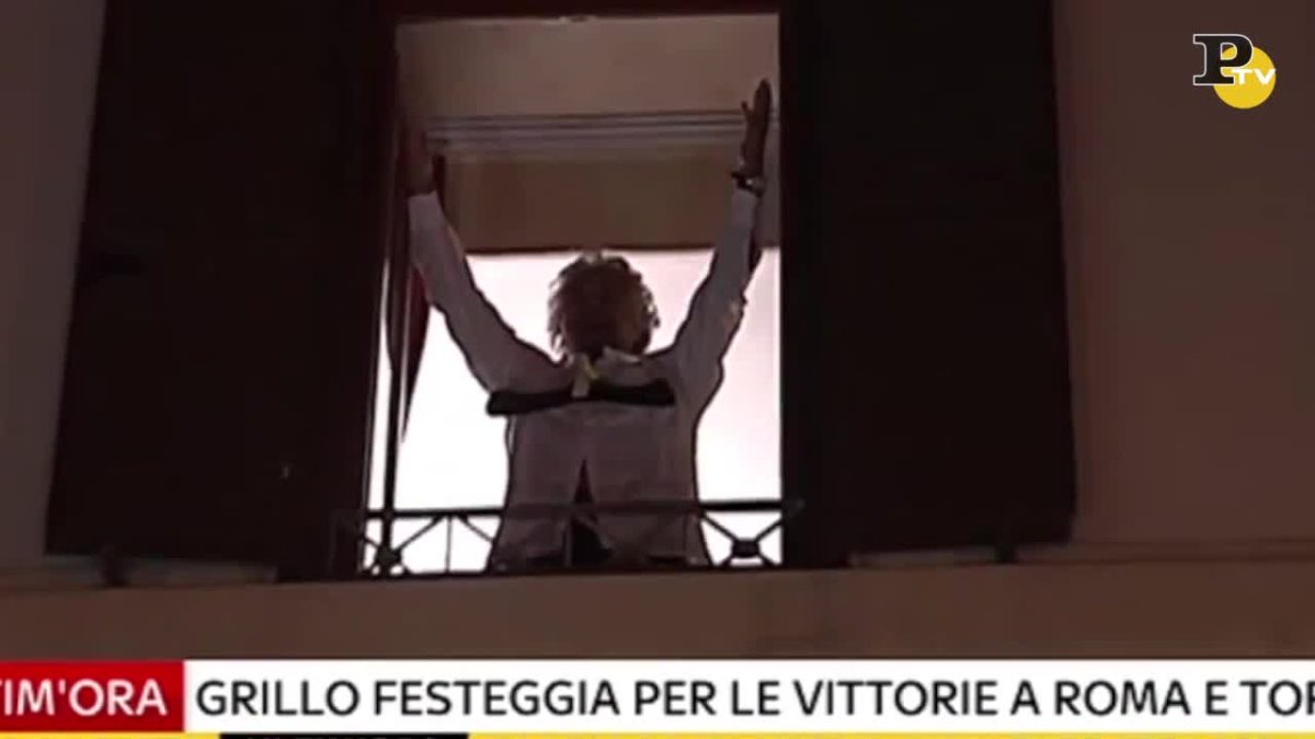 Beppe Grillo festeggia così il successo nei ballottaggi per le comunali a Roma con la Raggi ed a Torino con la Appendino del Movimento 5 Stelle.
