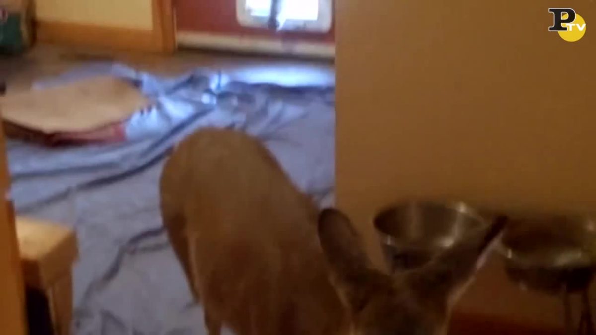 Stati Uniti, in una casa del Nebraska dalla “doggy door”, l’apertura che nella porta abitualmente permette ai cani di entrare ed uscire, spuntano due animali “anomali”. Si tratta di due giovani cervi, a caccia di cibo.