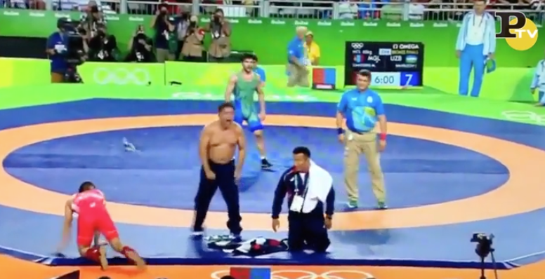I tecnici del lottatore mongolo si spogliano per protesta. Una protesta a dir poco clamorosa dei tecnici del lottatore mongolo Ganzorig al termine della finale per il bronzo olimpico nella categoria 65 kg. I due allenatori si sono spogliati, buttando a terra i vestiti, restando in mutande. Uno si è anche inginocchiato davanti alla giuria per contestare la decisione di assegnare la vittoria all’uzbeko Navruzov.