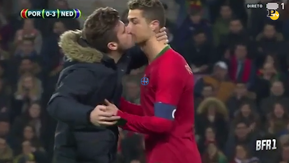 Durante la partita amichevole tra Portogallo e Olanda tre tifosi hanno fatto irruzione in campo e uno di loro ha anche baciato e fatto un selfie con Cristiano Ronaldo che ha reagito con calma. Ecco il video del bacio