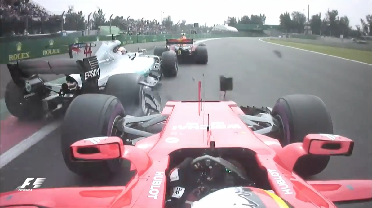 Dura pochi km il Gp del Messico di Formula 1 per Vettel ed Hamilton coinvolti in un incidente alla seconda curva pochi secondi dopo la partenza. Al via il ferrarista tiene la pole position ma alla prima staccata viene affiancato e superato dalla Red Bulla di Max Verstappen che non si tira mai indietro. Vettel è sorpreso e si trova a lottare anche con un tentativo di sorpasso da parte del rivale della Mercedes. L’alettone della Ferrari però tocca la gomma posteriore destra dell’inglese, bucandola. Morale: I due big in lotta per il mondiale si trovano nelle ultime due posizioni e sono costretti a fermarsi ai box per il cambio dell’alettone e della gomma.